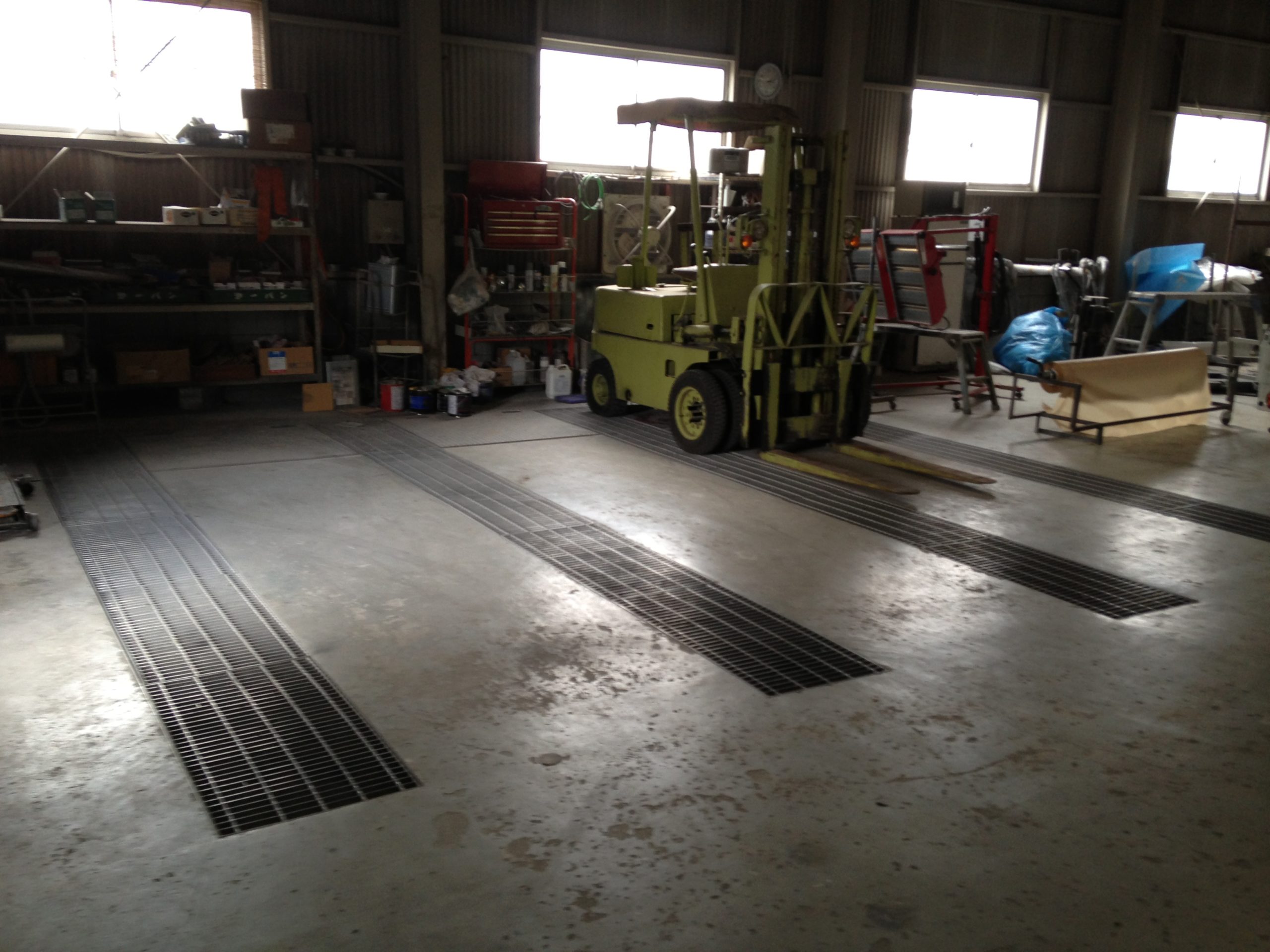 当工場の設備機器の自慢の一つでもある吸塵フロアーシステムです。