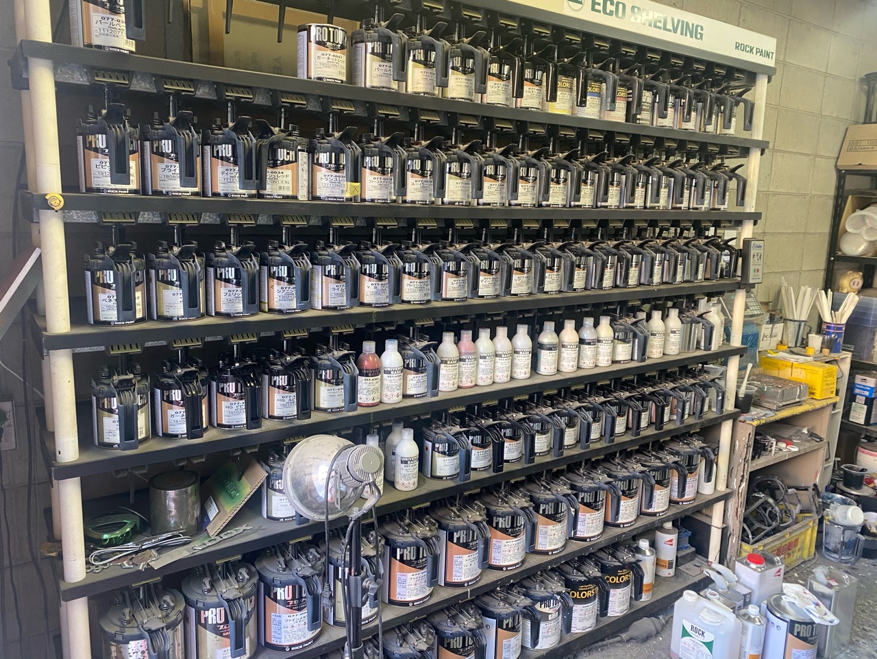 自動車塗装の調色には100種類近くの原色塗料が必要で、塗料が固まってしまうのを防ぐため、攪拌機能を持ったミキシングマシーンに塗料を収納し、定期的に塗料セットを同時に攪拌させるために使用します。